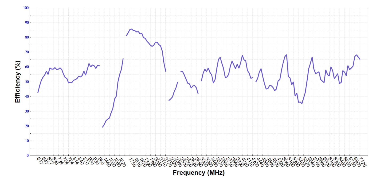 The graph shows the antenna efficiency for both 4G and 5G bands. The cellular bands for Opaca are in MHz: 617-960, 1420-1660, 1710-2170, 2300-2400, 2500-2700, 3300-4200, 4400-7125